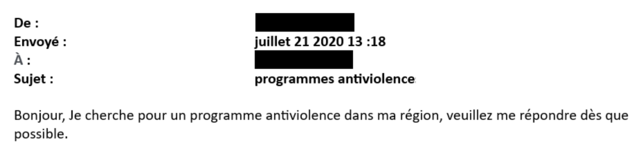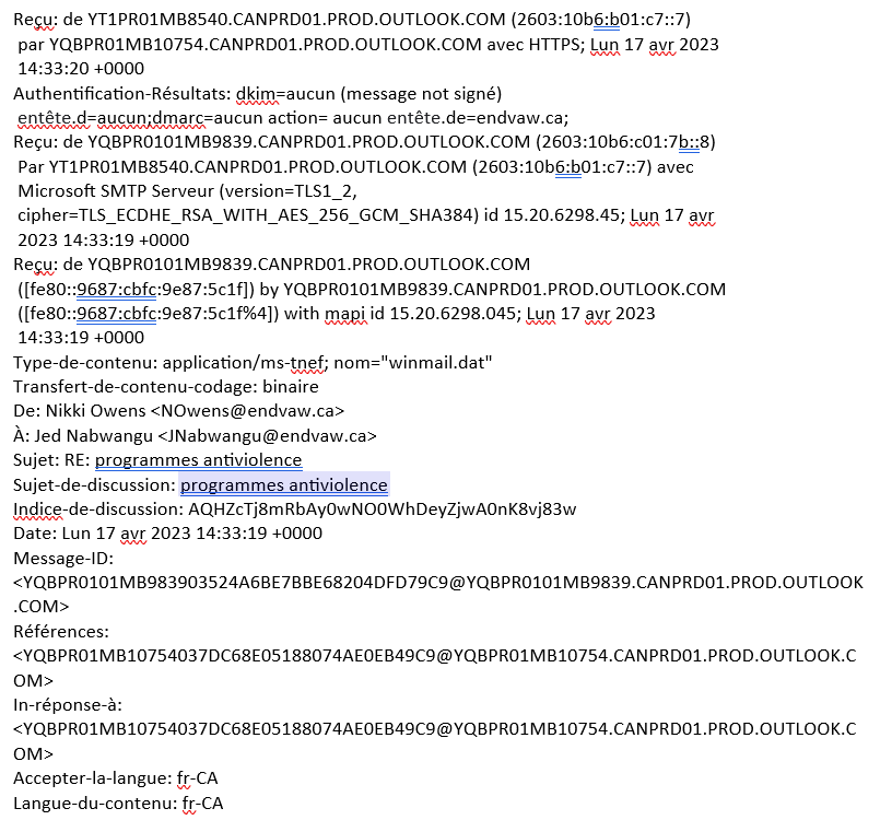 Note: La localisation d’une adresse IP permet de localiser une ville et non une adresse exacte (un mandat est nécessaire pour les localisations exactes). En outre, les adresses IP peuvent être facilement masquées et cela pourrait s’avérer inutile. - Preuve de l’identité de l’expéditeur Si vous recevez un courriel d’une personne utilisant une fausse adresse, ce qui est écrit dans le courriel peut vous aider à identifier l’expéditeur. Si vous recevez plusieurs courriels provenant d’une même fausse adresse courriel, vous pouvez les imprimer afin de démontrer que les différents courriels proviennent d’une même personne en établissant des modèles, des thèmes ou des choix de mots, de phrases ou d’expressions dans la communication. Si ces mots/phrases sont similaires à ceux utilisés par une personne que vous soupçonnez être à l’origine des courriels, vous devrez également rassembler des preuves à ce sujet. Par exemple, si vous pensez que les courriels anonymes proviennent de votre ancien partenaire parce que le mot «avant» est mal orthographié en «avans» et que c’est une erreur constante chez votre ex, vous voudrez sauvegarder des exemples de courriels ou de SMS antérieurs contenant cette faute d’orthographe d’usage. Les courriels ou SMS antérieurs peuvent vous aider à établir devant le tribunal que c’est bel et bien votre ex-partenaire qui a envoyé les messages anonymes.